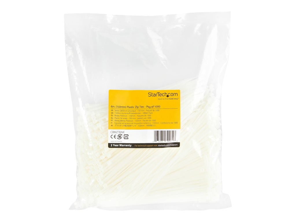 StarTech.com 15cm(6") Cable Ties, 3mm(1/8") wide, 39mm(1-3/8") Bundle Diameter, 18kg(40lb) Tensile Strength, Nylon Self Locking Zip Ties w/ Curved Tip, 94V-2/UL Listed, 1000 Pack, White - Nylon 66 Plastic - TAA (CBMZT6NK) - Kabelbinder - TAA-konform |